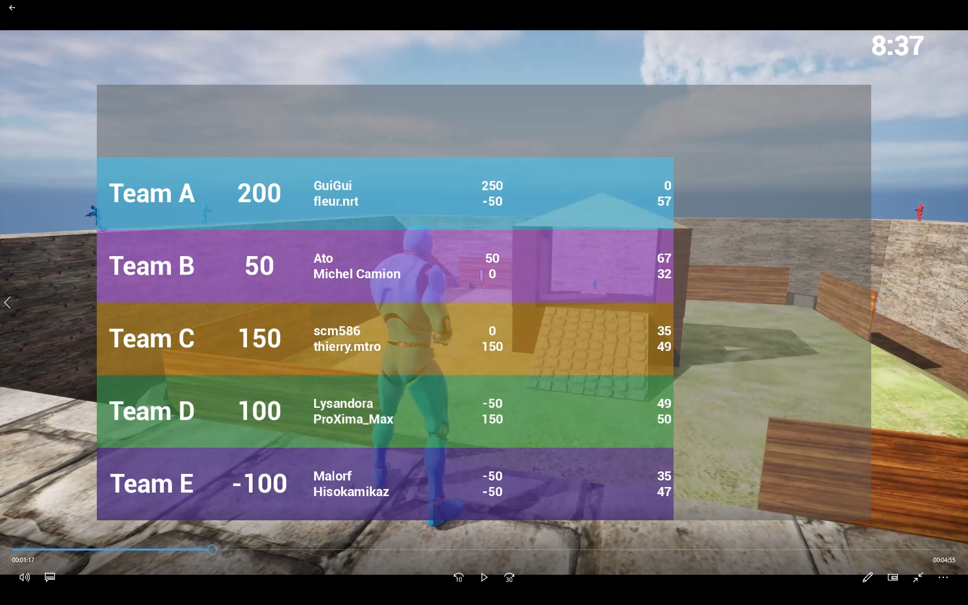 In order to spice up the fight, the reds will only be able to hit the other reds and the same for the blues. When a player is hit, he becomes cursed (off-pitch) and can only come back if he manages to hit a player of his color still present on the pitch. Victory is declared when both members of the same team are still on the field while the others are off ! (or at the end of the timer)